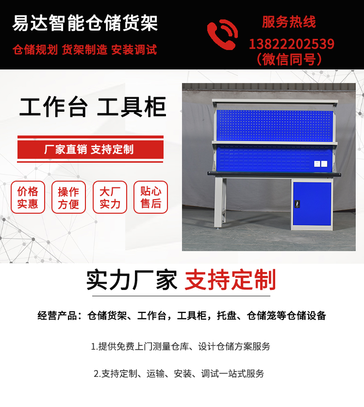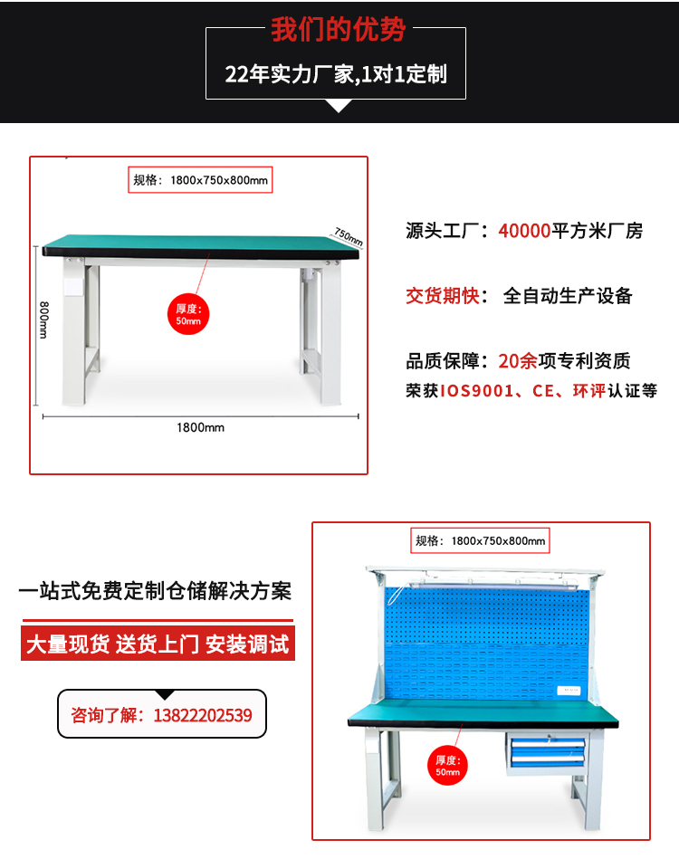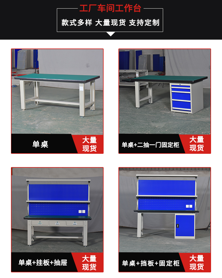 工作台也叫工作桌、操作台、车间工作台、防静电工作台、耐磨桌、工厂车间重型维修钳工作台、钳工台、工作维修台、抽屉式工作台、带挂板工作台、维修工作柜、置物柜、工具柜、工具车、抽屉工具柜等,可协助货物的存储、拣选、打包、输送等,功能强大,作业灵活。